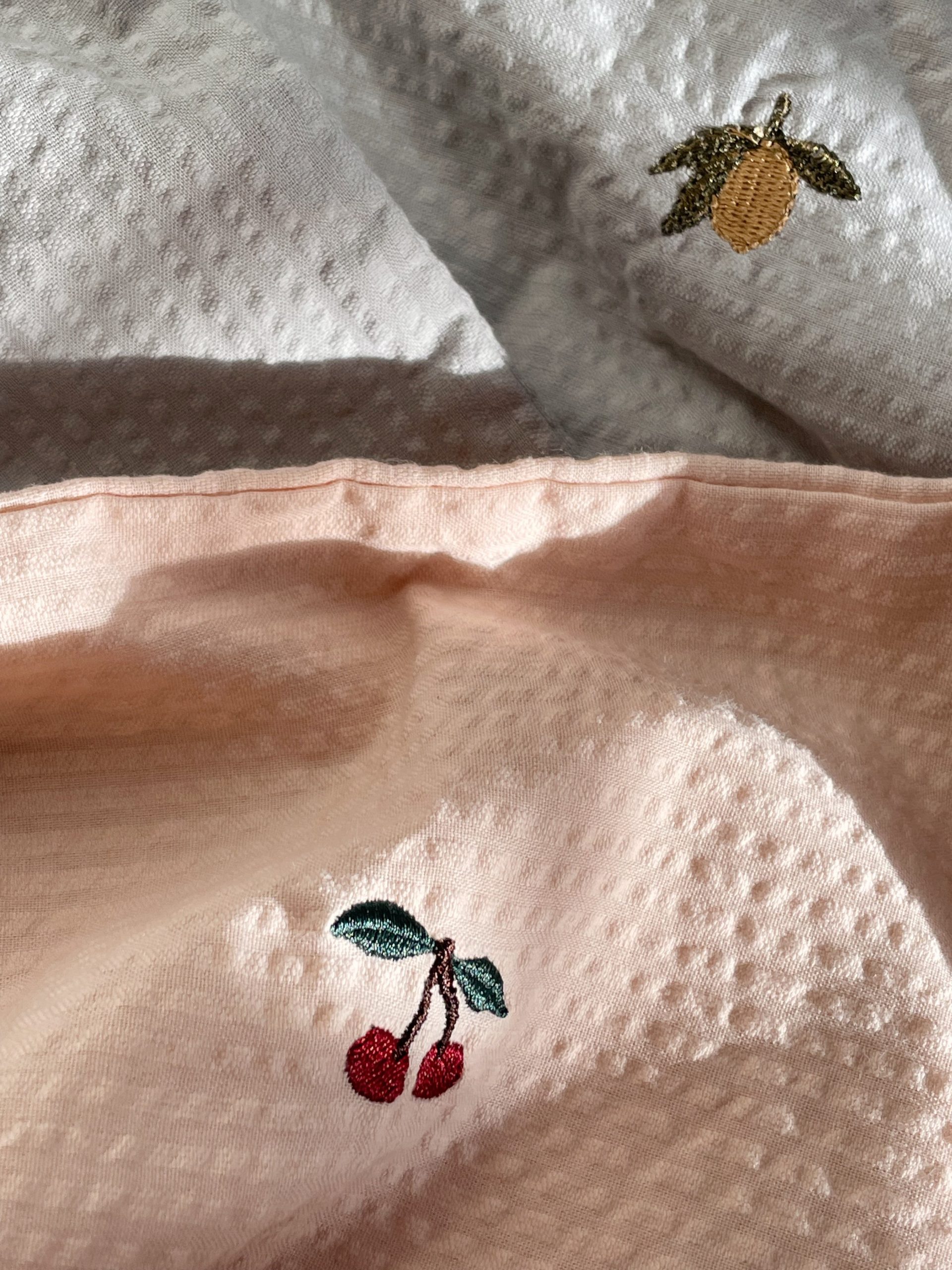 Please note that the name is embroidered in italics and that individual letters will appear with a “connecting line” to the rest of the name. You can see how the letters are written in the picture below the bedding.