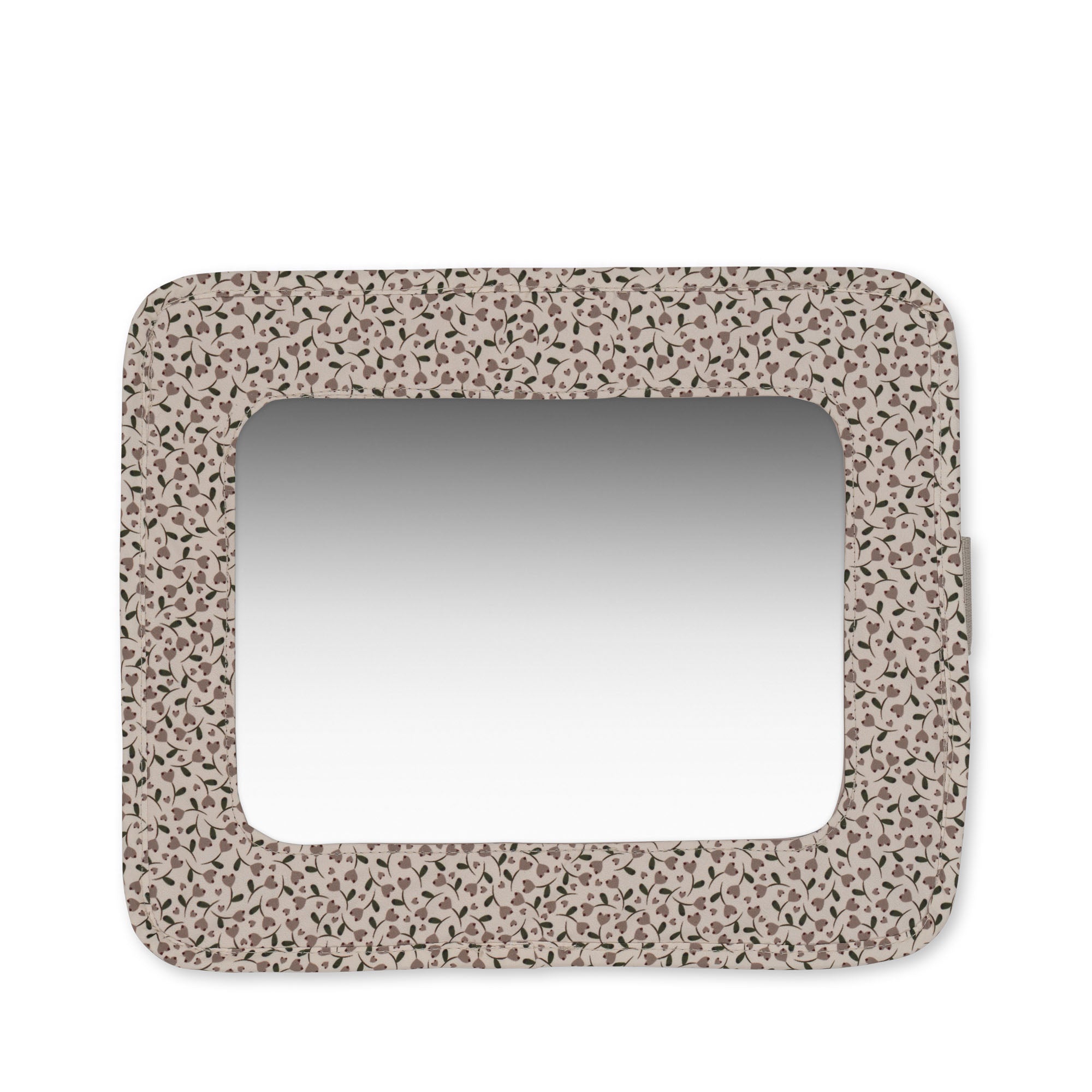 Multifunctional accessory with mirror on one side and tablet holder on the other. Attaches to headrest with an adjustable strap.