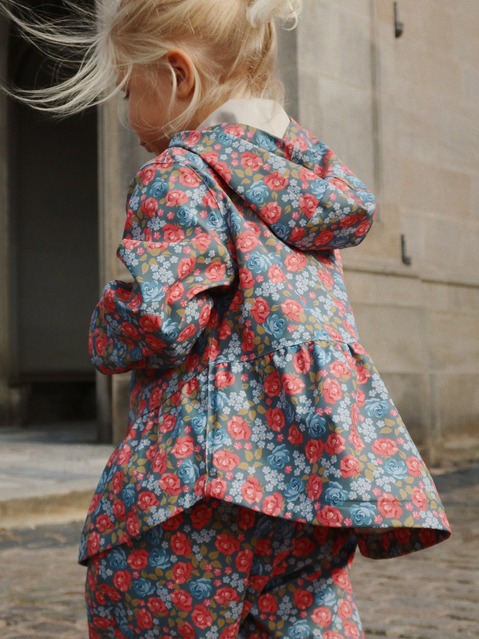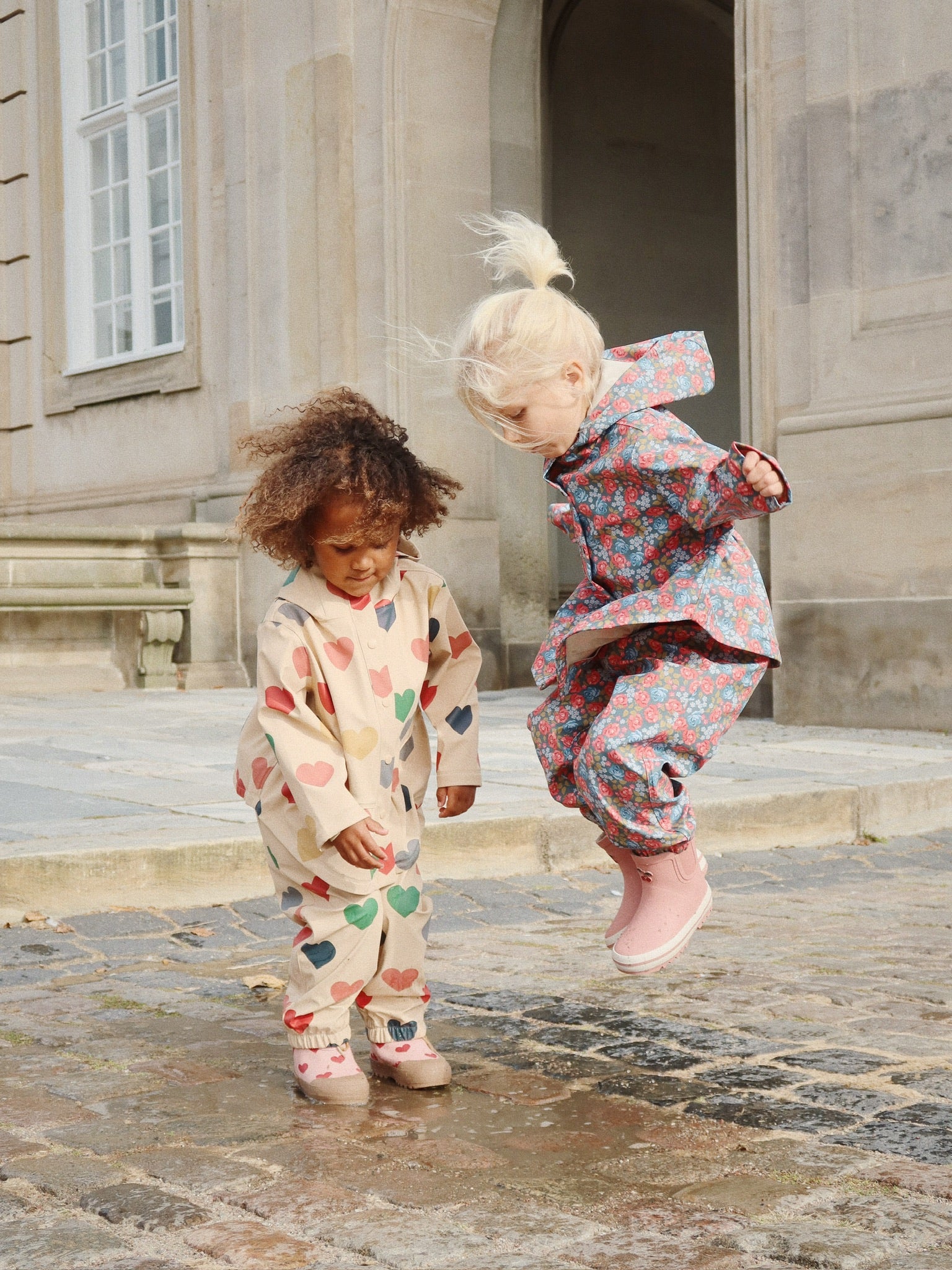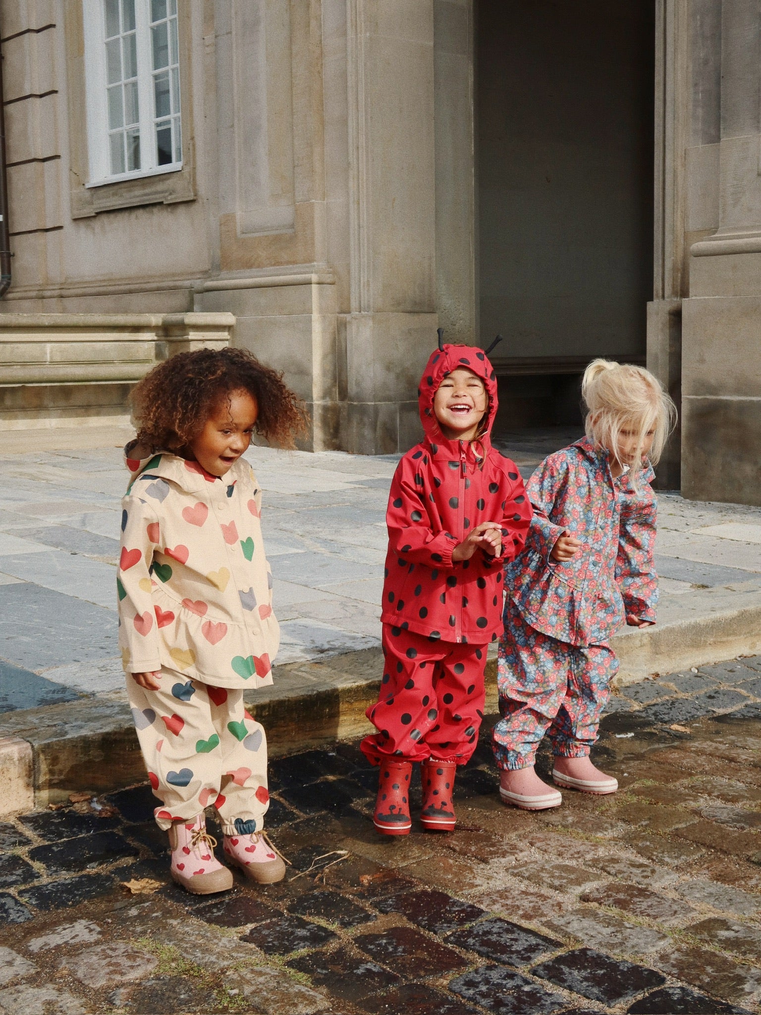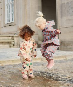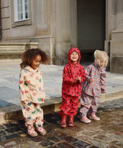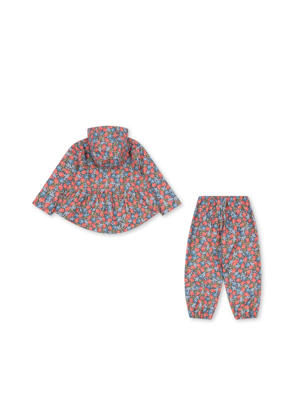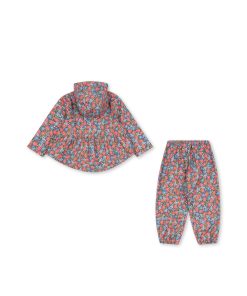 Lightweight rain set that is ideal for kindergarten and daycare wear. The rain set is both wind-resistant and water-repellent with practical features like welded seams, elastic waist, and elastic cuffs at hands and ankles that fit over rain boots and gloves.