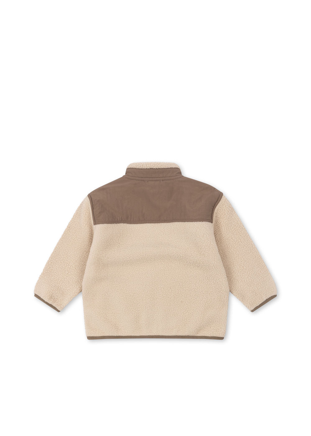 Jacket in a soft fleece quality with a brushed feel. Made from 100% recycled polyester. Designed with a high collar, practical pockets lined with organic cotton, and thumb holes at sleeve end.