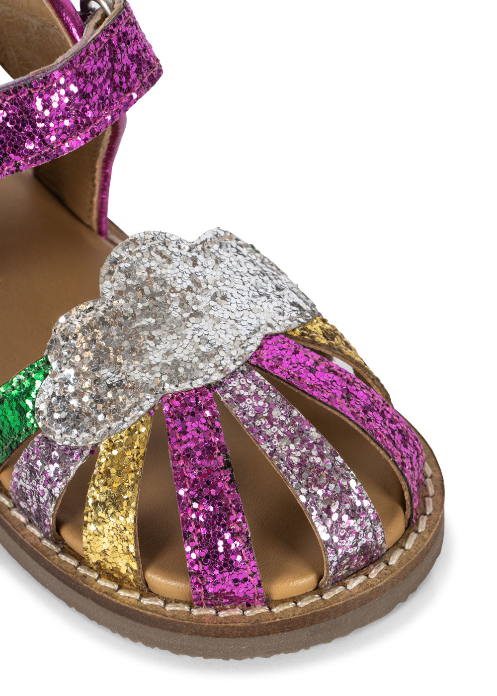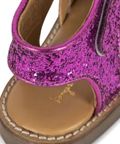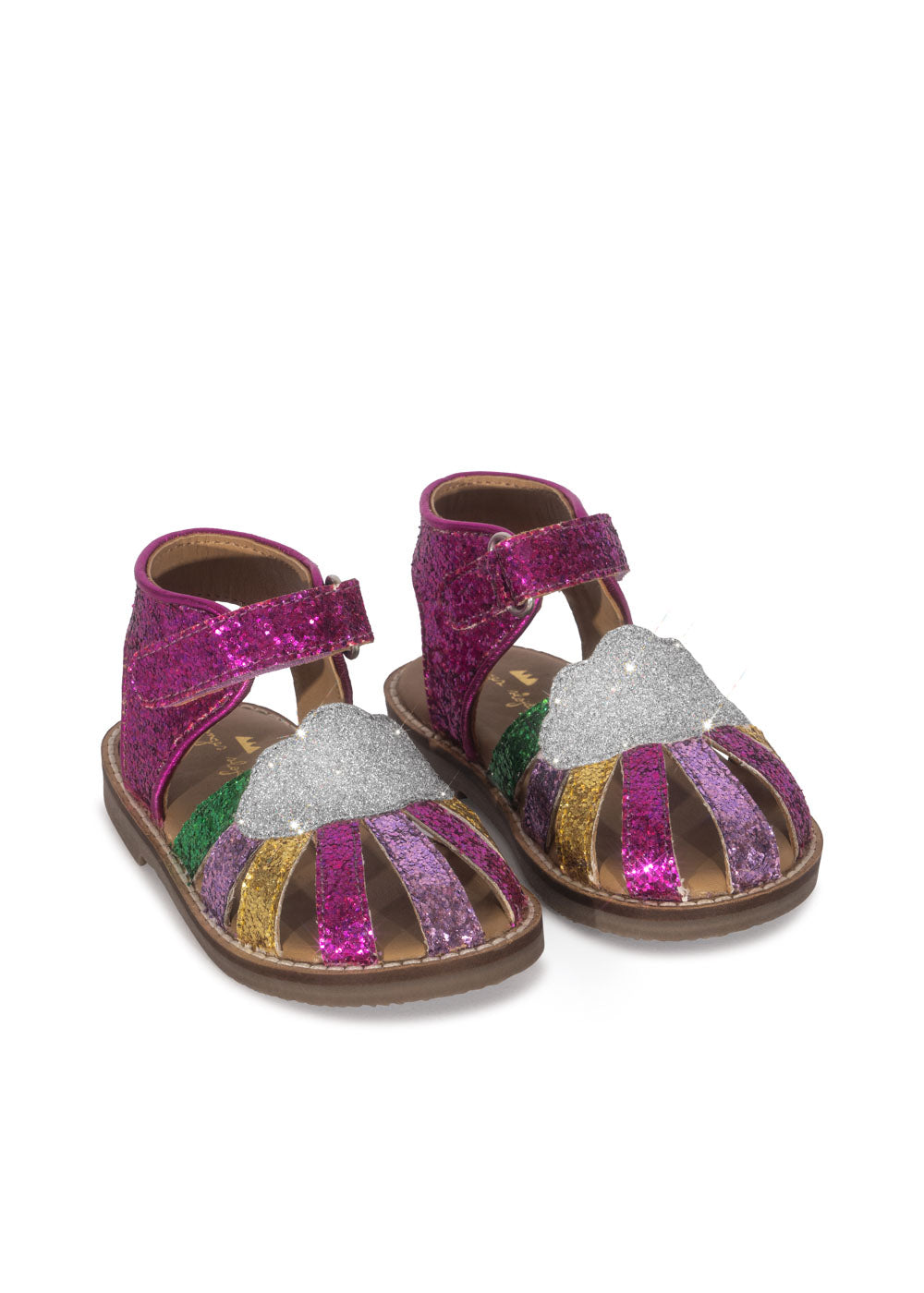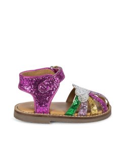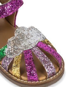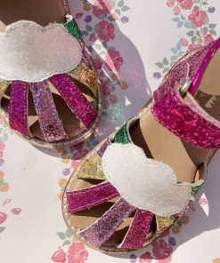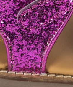 Sparkly summer sandals with a classic buckle and strap closure. Made with thermoplastic rubber soles for added stability and thermal resistance.