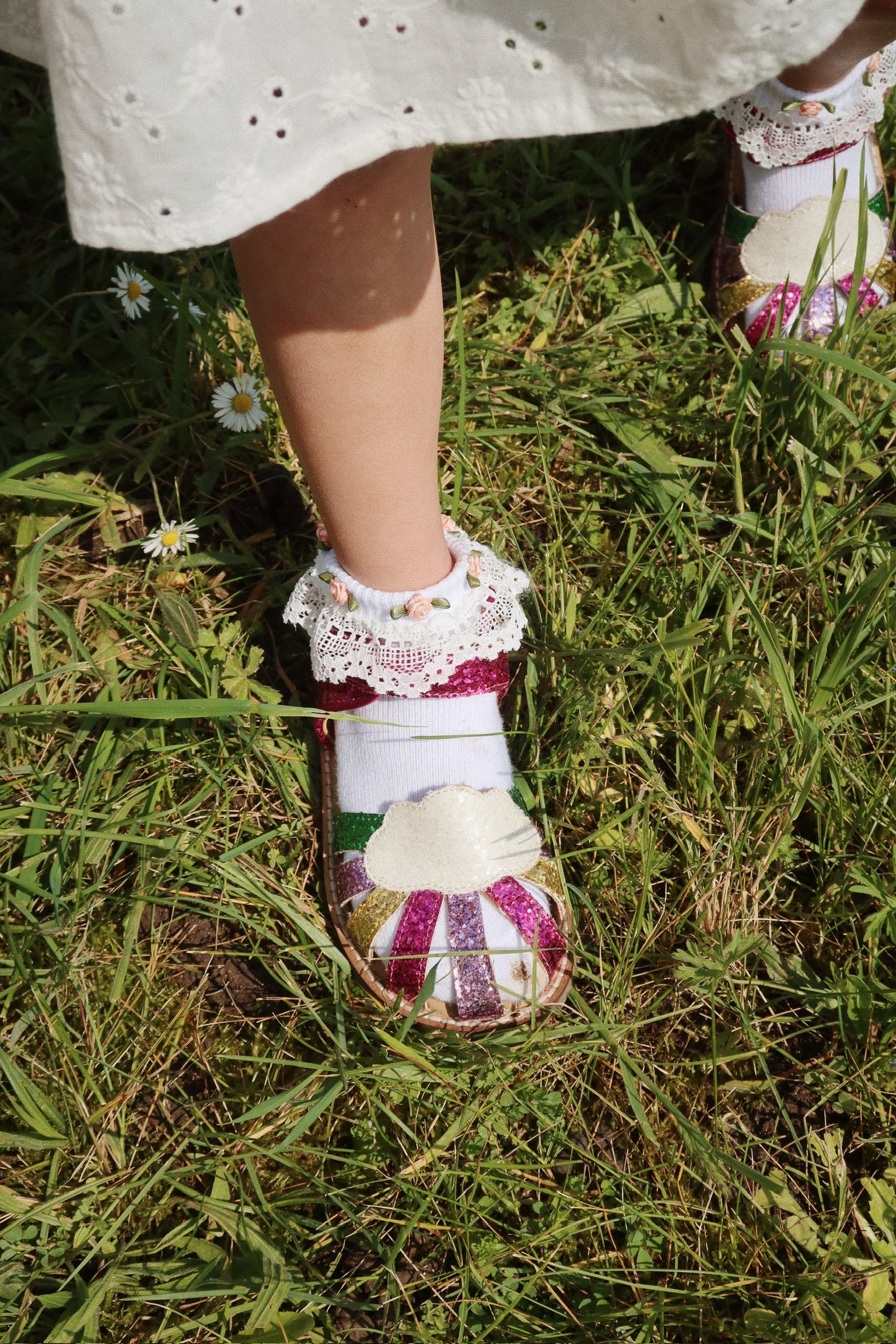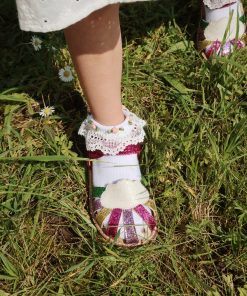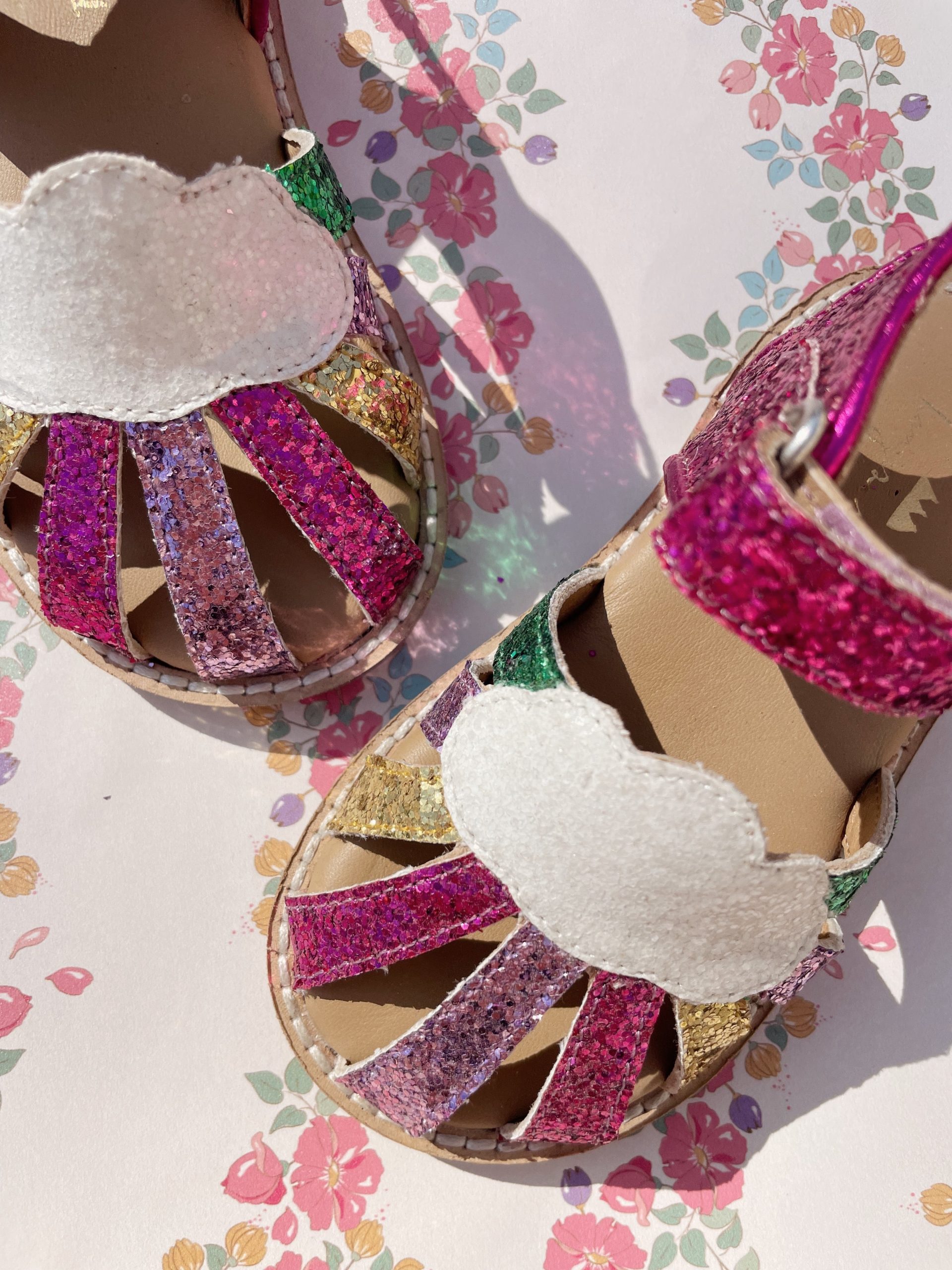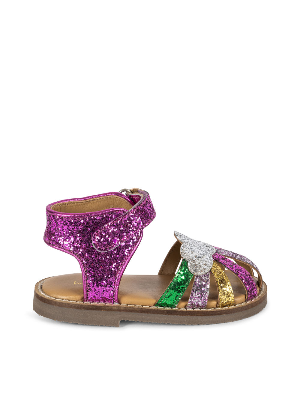 Sparkly summer sandals with a classic buckle and strap closure. Made with thermoplastic rubber soles for added stability and thermal resistance.