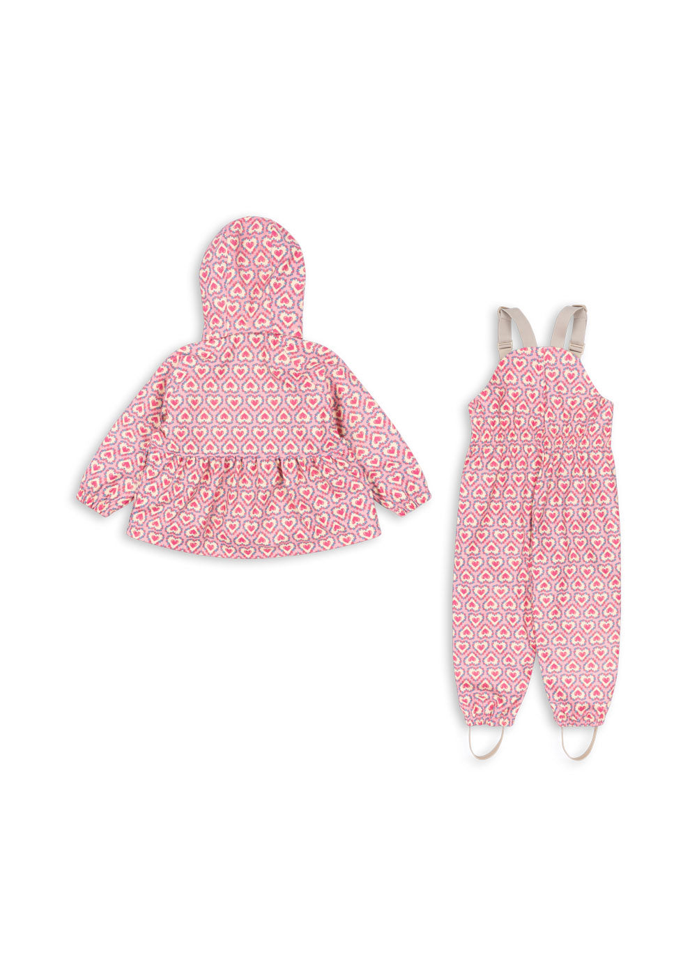 Wind-resistant and waterproof PU rain set with warm fleece lining inside. Features essential detailing like a lined, detachable hood, elastic cuffs, and welded seams for complete protection against the elements.